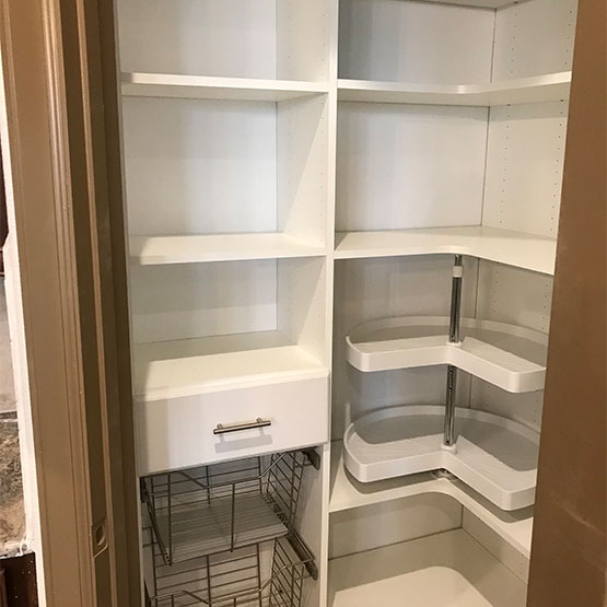The kitchen is one of the first rooms where we start our day, and an organized, custom kitchen pantry can help bring a little order to a hectic morning. A custom pantry can transform this sometimes-disorganized food storage area into a multi-functional space that doesn’t just conveniently store ingredients but becomes an area where you can easily find and retrieve snacks and beverages and provide storage for smaller kitchen appliances and tools. The professional designers at More Space Place will work with you to design a custom pantry that is designed for your storage preferences and around the way you work. They will help you choose from a multitude finishes, door styles and pantry accessories that will ensure a well-designed space that will transform any kitchen. Check out our custom pantries below.